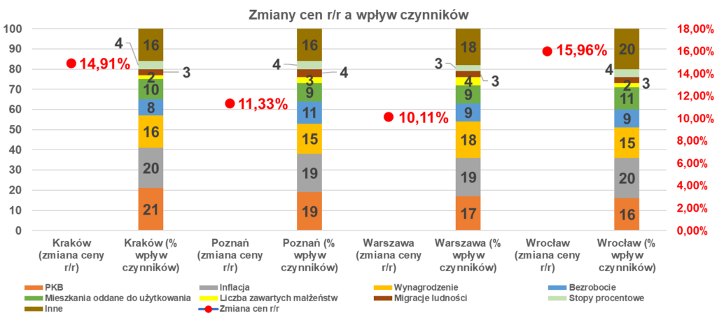 Przyjrzyjmy się w jakim stopniu poszczególne czynniki wpływały na zmiany cen na rynku nieruchomości w ciągu ostatniego roku (uzupełniając grono 3 analizowanych miast o Warszawę).