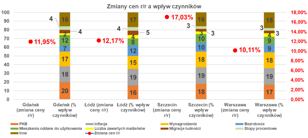 Spójrzmy jak poszczególne czynniki wpływały na zmiany cen na rynku nieruchomości w ciągu ostatniego roku (uzupełniając grono 3 analizowanych miast o Warszawę).