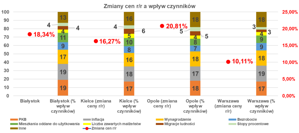 Tym razem przyjrzymy się jak poszczególne czynniki wpływały na zmiany cen na rynku nieruchomości w ciągu roku (uzupełniając grono 3 analizowanych miast o Warszawę):
