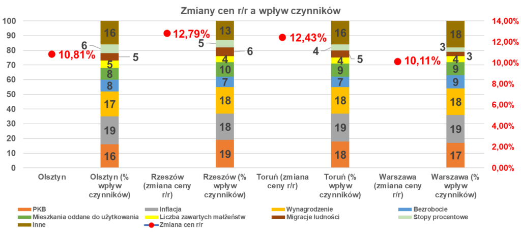 Przyjrzyjmy się jeszcze jak poszczególne czynniki wpływały na zmiany cen na rynku nieruchomości w ciągu roku (uzupełniając grono 3 analizowanych miast o Warszawę):
