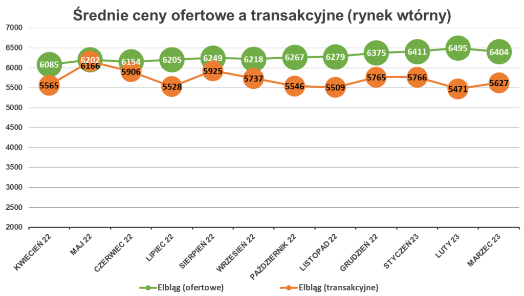 W okresie od kwietnia 2022 do marca 2023 roku rynek nieruchomości w Elblągu był stosunkowo stabilny. Ceny transakcyjne wzrosły średnio o około 2%, ale w tym okresie obserwowano także pewne niewielkie spadki. Najwyższe ceny transakcyjne odnotowano w sierpniu 2022 roku, po czym nastąpiła ich stabilizacja, a ceny ofertowe wykazały minimalny wzrost na przełomie 2022 i 2023 roku.