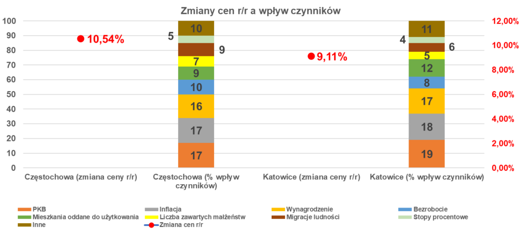 W przypadku Katowic, głównym czynnikiem, który wpływał na zmiany cen nieruchomości, były natomiast mieszkania oddane do użytku. Katowice, jako jedno z głównych miast województwa, doświadczały dużej liczby nowych inwestycji mieszkaniowych, co miało wpływ na rynek nieruchomości. Częstochowa, choć nie obserwuje takich dużych inwestycji, odnotowuje wzrost liczby transakcji na rynku wtórnym, co wskazuje na rosnącą popularność tego typu mieszkań.