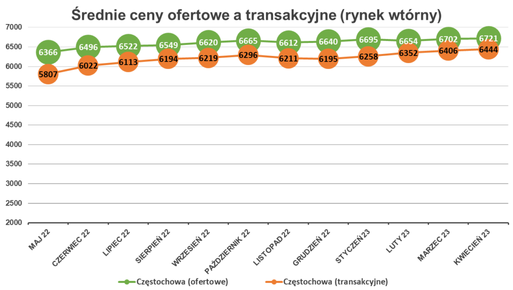 Na poniższym wykresie przedstawiono porównanie średnich cen ofertowych i transakcyjnych na rynku wtórnym w Częstochowie w ciągu ostatnich 12 miesięcy.