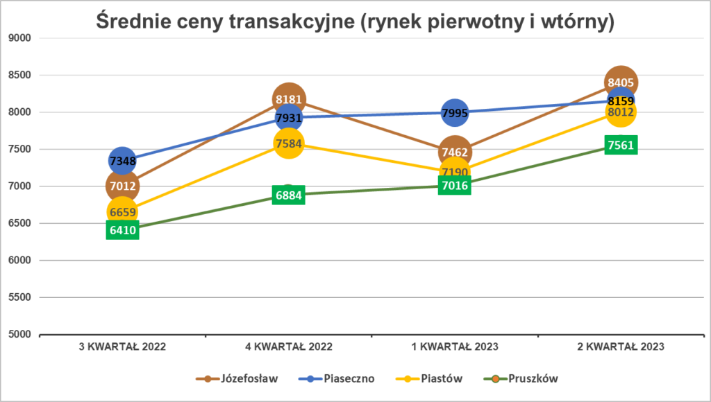 W analizowanym okresie (lipiec 2022 – czerwiec 2023) na rynku nieruchomości w Józefosławiu, Piasecznie, Piastowie i Pruszkowie obserwowano różnorodne zmiany cen. Największe wahania miały miejsce w Józefosławiu, gdzie ceny wzrosły o 19% w 2022 roku, by w pierwszym kwartale 2023 roku doświadczyć spadku. Piastów również odnotował podobny trend, z wyraźnym wzrostem cen w ostatnich miesiącach 2022 roku, a następnie spadkiem w pierwszym kwartale 2023 roku. Z kolei Piaseczno i Pruszków wyróżniały się stabilnym, ale ciągłym wzrostem cen nieruchomości. Wzrost wynagrodzeń, inflacja i zmiany w PKB miały kluczowy wpływ na sytuację na rynku nieruchomości w tym okresie. Warto jednak zauważyć, że dla osób szukających nieruchomości w pobliżu Warszawy, miejscowości takie jak Piaseczno i Pruszków pozostają stabilnym wyborem, natomiast Józefosław i Piastów mogą przyciągać tych, którzy są gotowi zainwestować w nieruchomości w miejscowościach, które przeżywają dynamiczne zmiany.